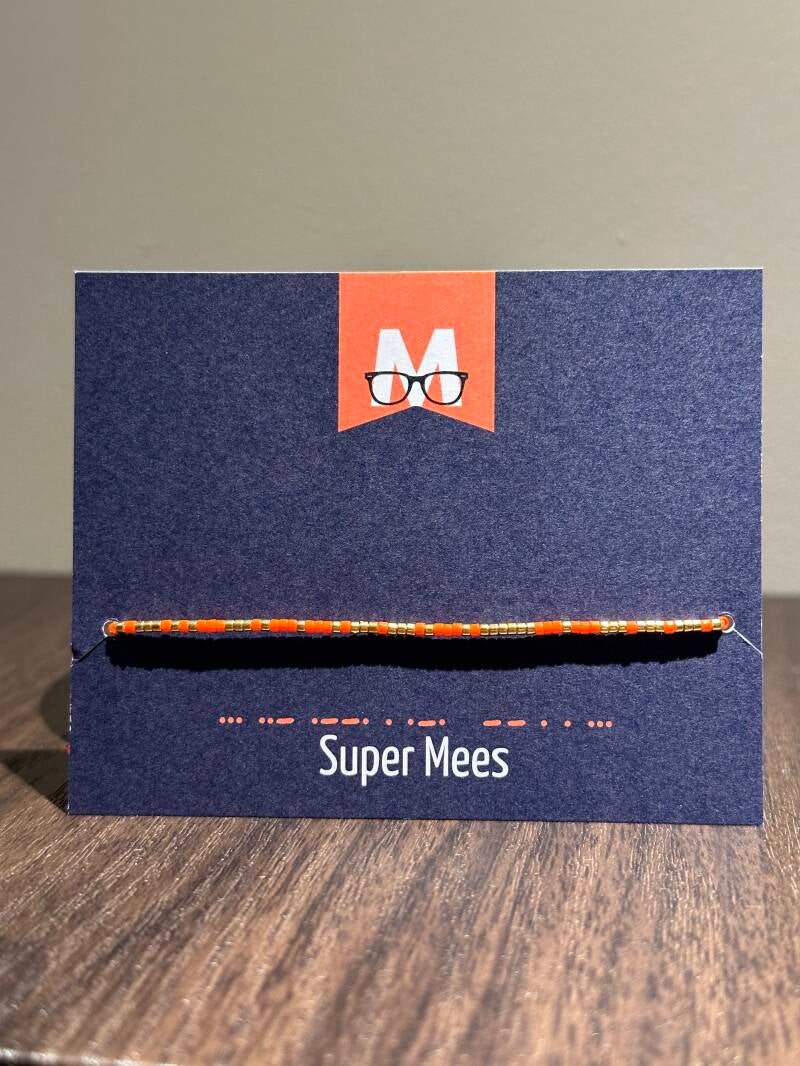In het armbandje is de morsecode Super Mees verwerkt.
