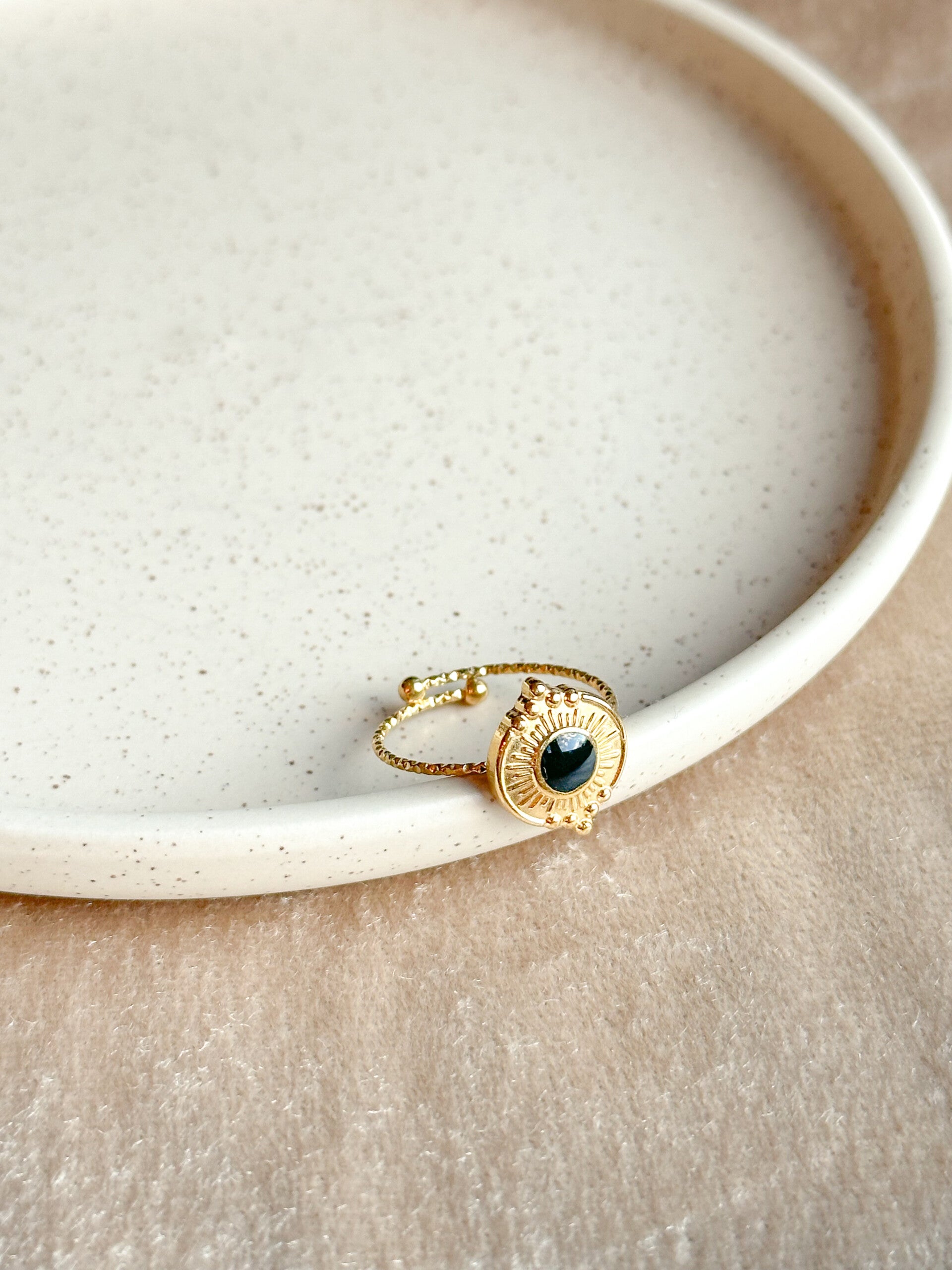 Mooie ring met een zon die gevuld is met zwart enamel.